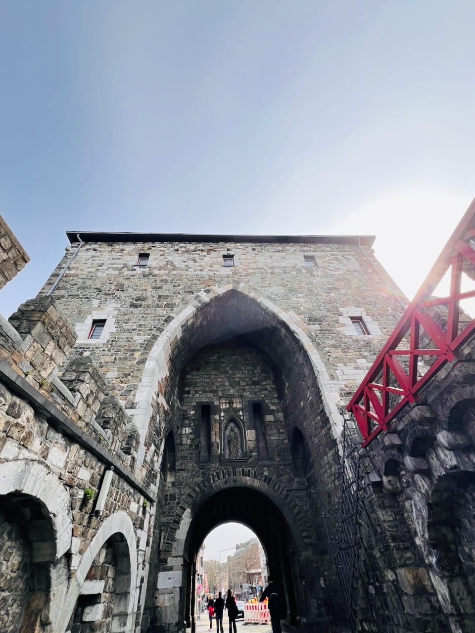 Bild 1: das Ponttor, ein aus dem 17./18. Jahrhundert stammendes Tor aus verschiedenen Sandsteinen. Das Foto wurde im Inneren des Tors aufgenommen. Im Torbogen stehen ein paar Menschen, eine Baustelle ist dahinter in der Straße zu sehen. Die Sonne scheint schräg vorbei. Bild 2: eingerahmt wird das Bild durch zwei moderne, hohe Gebäude. Rechts sieht man eine Treppe, die eine Ebene runter führt, umgeben von einer Hecke und Bäumen. Das Gebäude links hat im Untergeschoss eine Glasfront. Im Hintergrund, gegenüber, ist ein weiteres, älteres Gebäude zu sehen. Das Foto ist schwarz-weiß. Bild 3: von unten gegen den Himmel fotografiert sieht man die beiden hohen Gebäude aus einer anderen Perspektive. Die Sonne spiegelt sich in dem einen Gebäude. Das Foto ist schwarz-weiß.