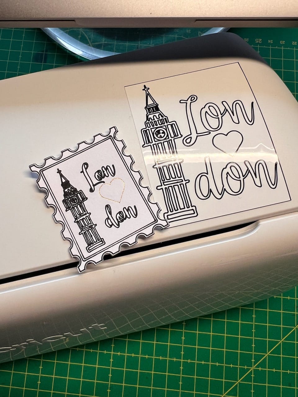 weitere bisherige Projekte: eine "Briefmarke" mit einem folierten Herz, dem Elizabeth Tower und einem Schriftzug (alle Formen stammen aus dem Design Space). Auf dem Cricut klebt das gleiche Motiv (nur ohne das folierte Herz). Beides wurde mit einem der Cricut-Stifte gemalt. In der Mitte: eine gerollte Blume. Rechts: Stickerversuche auf bedruckbarem Vinly (bei meinen Eltern gedruckt, weil die einen Inkjet-Drucker haben)