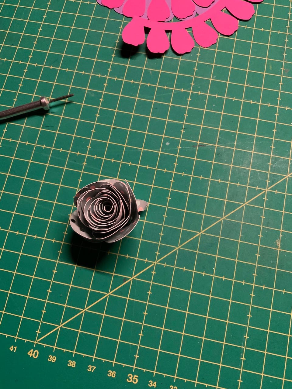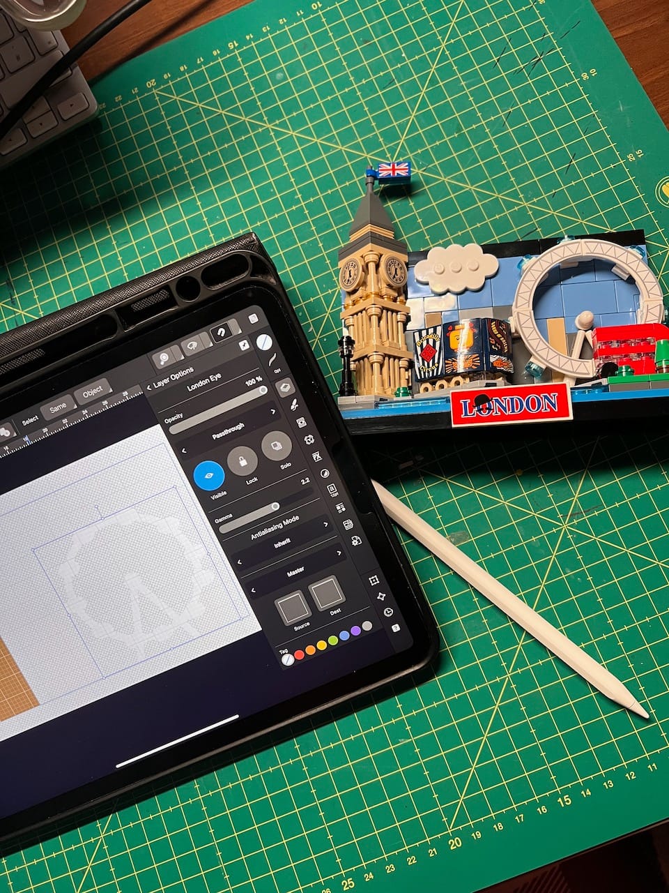 links das fertige Teil, rechts entstehen die Formen in Affinity Designer. Neben dem iPad liegt die Vorlage dafür.