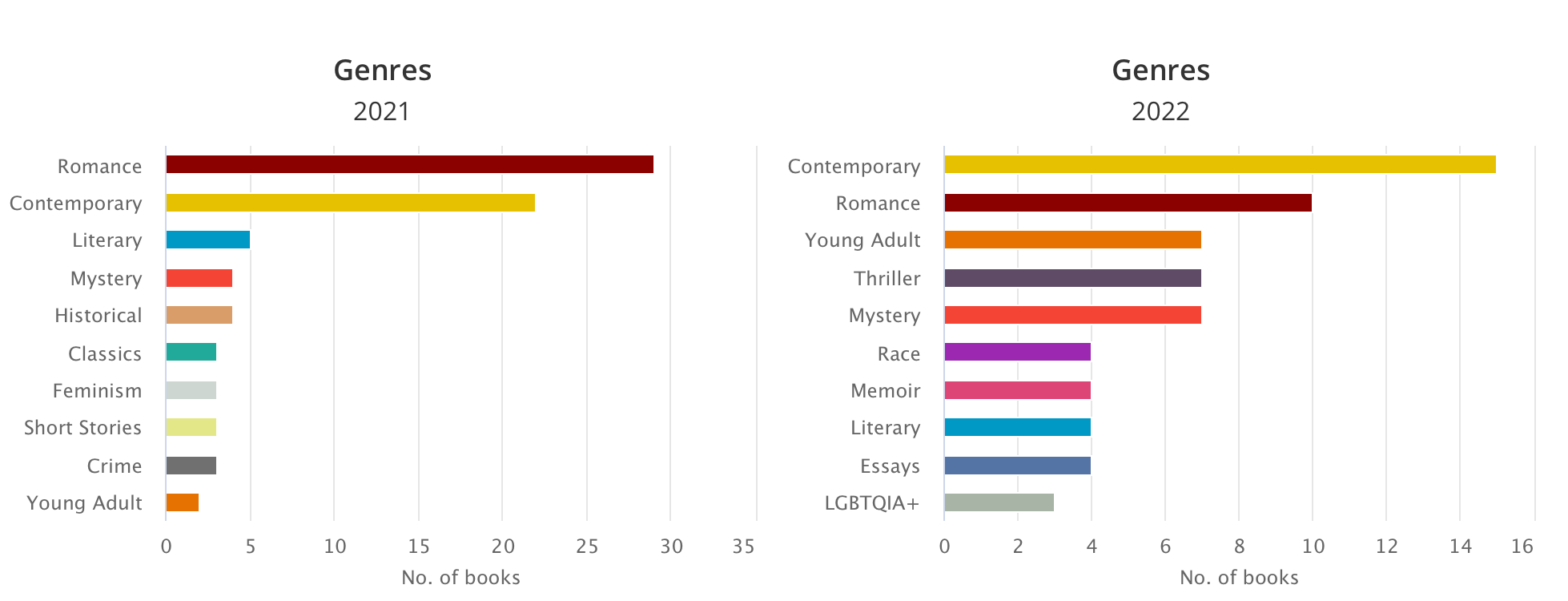 Ein Blick auf die Genres zeigt, dass "Contemporary", also zeitgenössische Bücher/Literatur, weit vorne liegt mit 15 Büchern, dicht gefolgt von "Romance" (10).