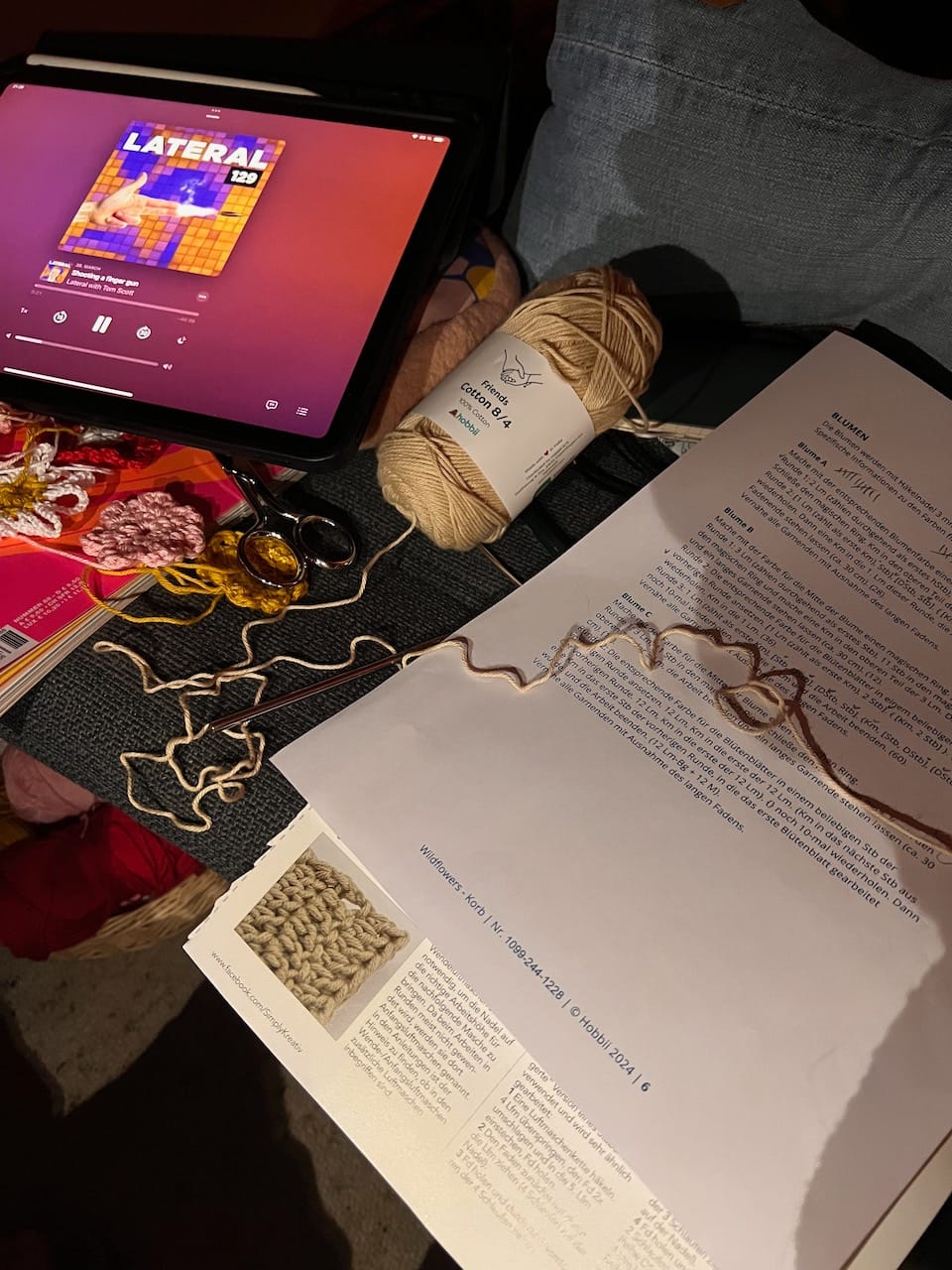 Ihr benutzt Fußbänke doch auch als Ablage für Kram, oder? Den weiteren Abend habe ich mit Häkeln und Podcasts hören verbracht. Ich möchte den Wildflowers-Korb von Hobbii häkeln und dazu verbrauche ich gerade mein buntes Baumwollgarn und häkel die vielen Blümchen. Das Papiergarn für den Korb selber kaufe ich später noch.