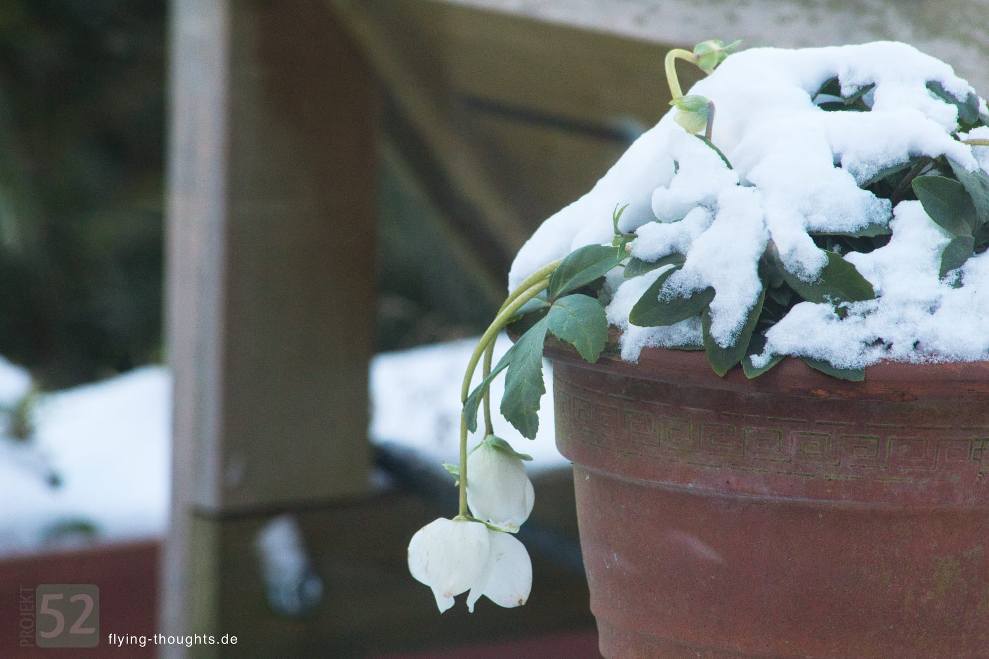 Blumen sind nicht zu sehen. Im Januar blühen auch nur wenige und auch im Haus sind außer künstliche, getrocknete oder Lego-Blumen keine zu sehen. Auf der Terrasse steht aber ein Topf mit einer Christrose. Als es letztens gefroren hat, ließ sie ihre weißen Blüten hängen. Jetzt hat der Schnee sie zugedeckt und die Blüten, die sich noch vor wenigen Tagen wieder aufgerichtet haben, haben wieder traurig ihre Köpfe hängen gelassen.