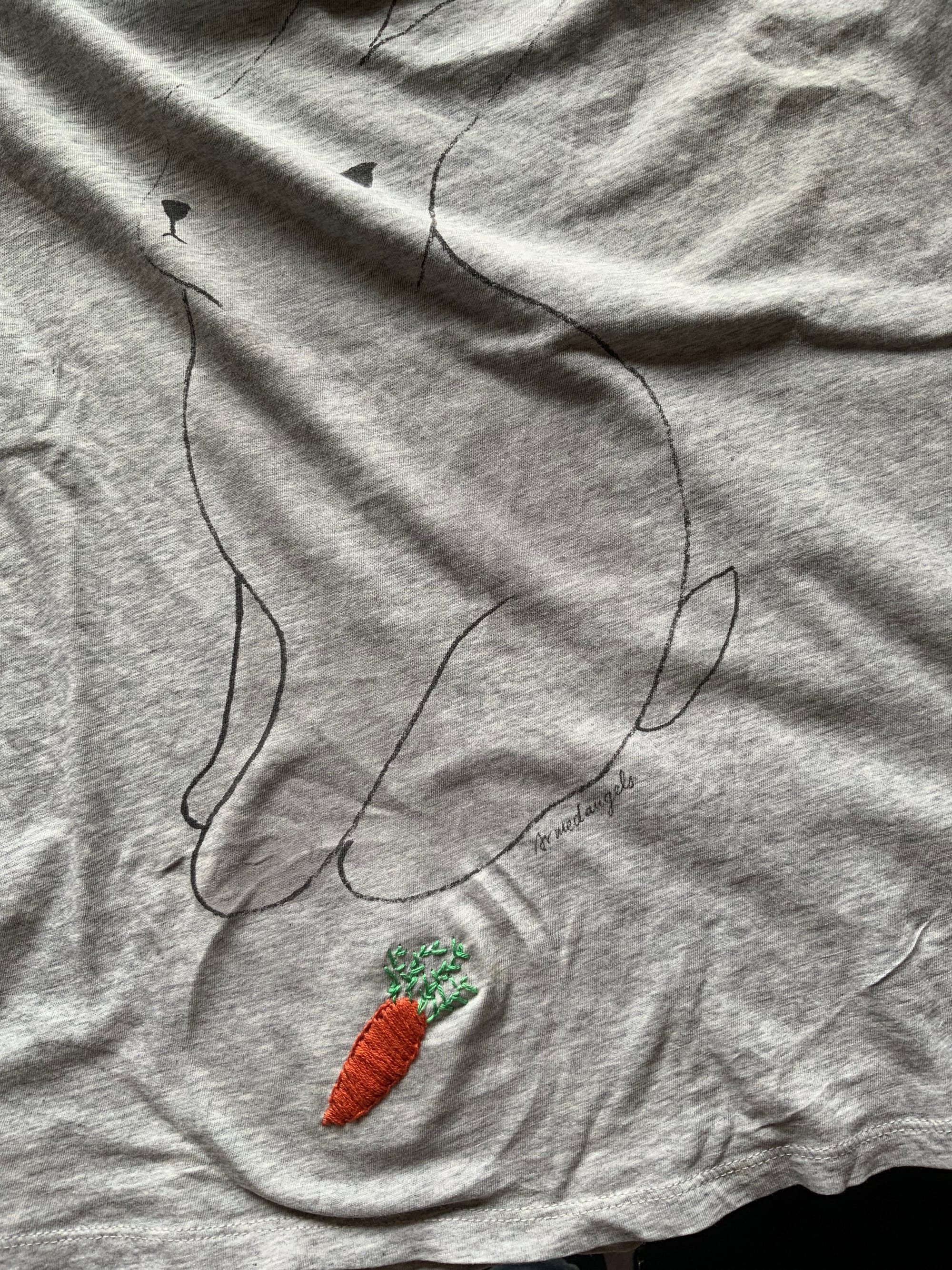 Desweiteren gab es noch ein paar Flickarbeiten an Hosen und auch an einem T-Shirt von mir. Für das T-Shirt habe ich mich für Visible Mending entschieden und eine Möhren über das Loch gestickt. Um den Stoff zu schützen, habe ich auf die Rückseite ein Stück Stickvlies* gelegt.