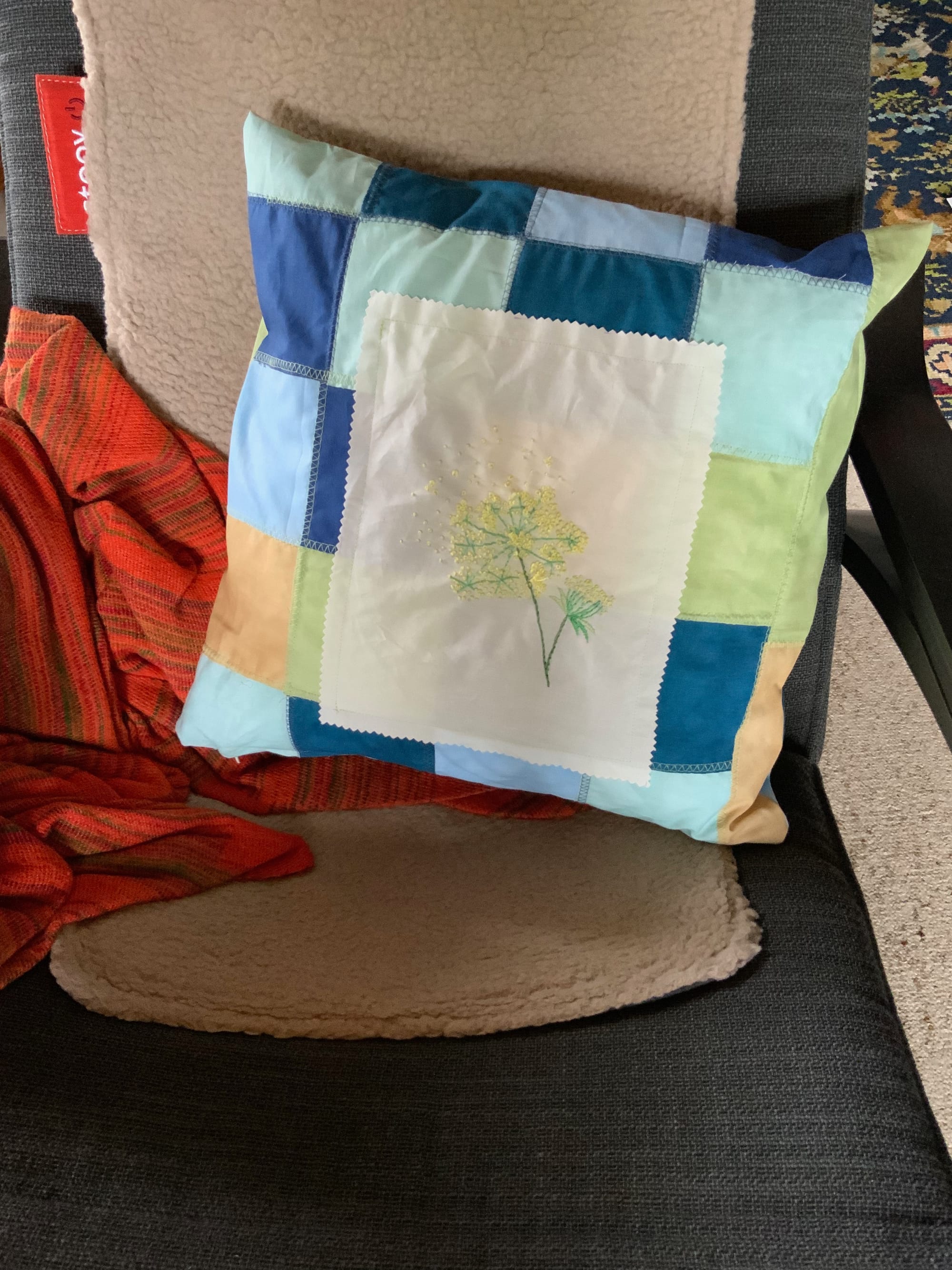 1. selbstgenähtes Kissen (mit Reißverschluss!) mit gestickter Blume auf weißem Stoff. 2. Anfang eines Einkaufsnetzes. 3. das T-Shirt hatte ein Loch und an der Stelle ist nun eine Möhre aufgestickt. 4. gerade frisch genähte Schlafanzughose.
