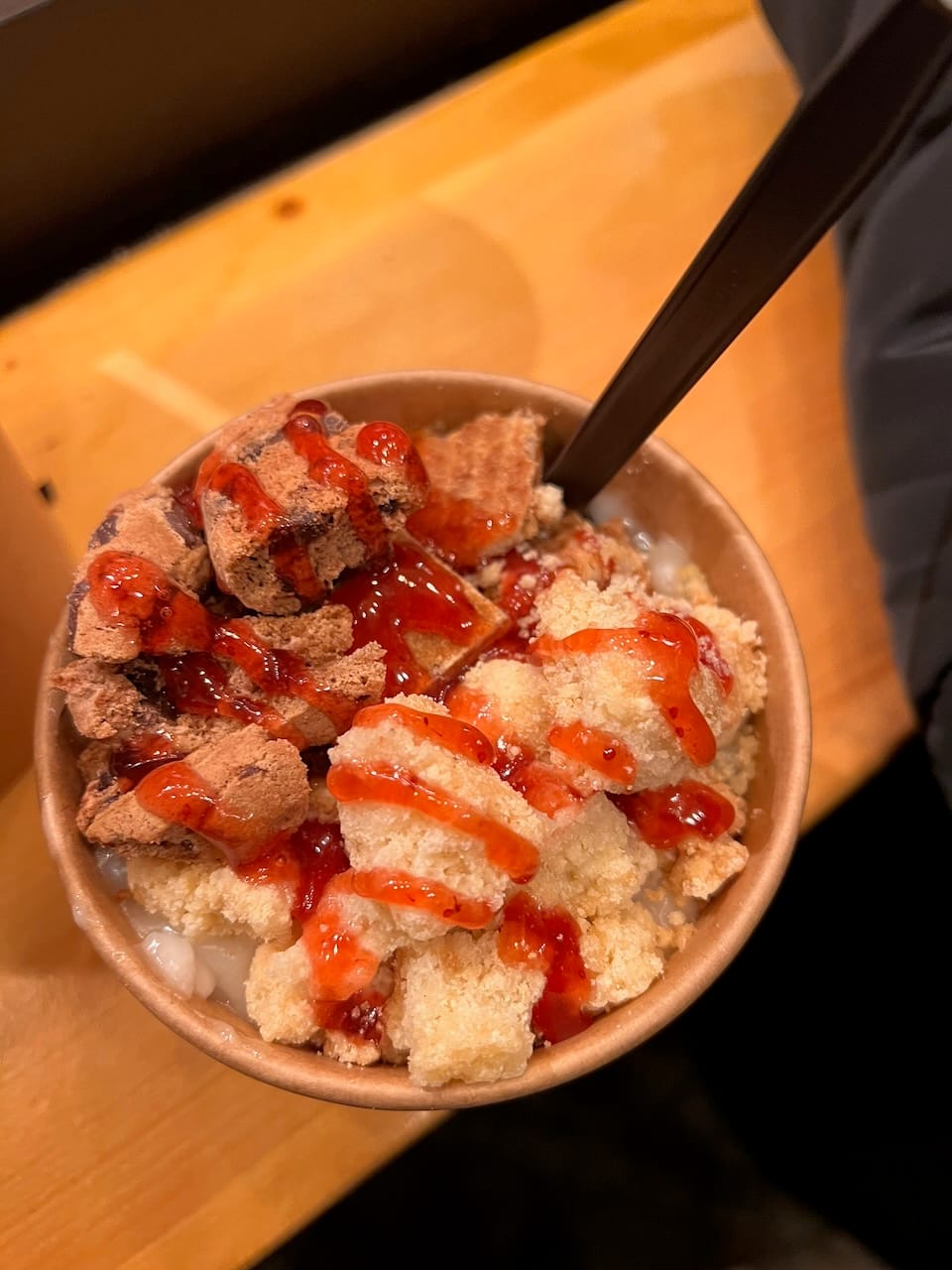 Auf dem Weihnachtsmarkt wanderte dann noch ein Strang Alpaka-Wolle in meinen Beutel sowie ein Fläschchen Zirbelöl. Da der Mann einer Kollegin einen Stand auf dem Weihnachtsmarkt hat (Milchreis und Griesbrei), mussten wir da auch noch hin. Ich hab mich für Milchreis mit Stroopwaffel, Streuselbrötchenstreusel und Cookies entschieden, dazu eine Erdbeersoße. Mmmmmh!